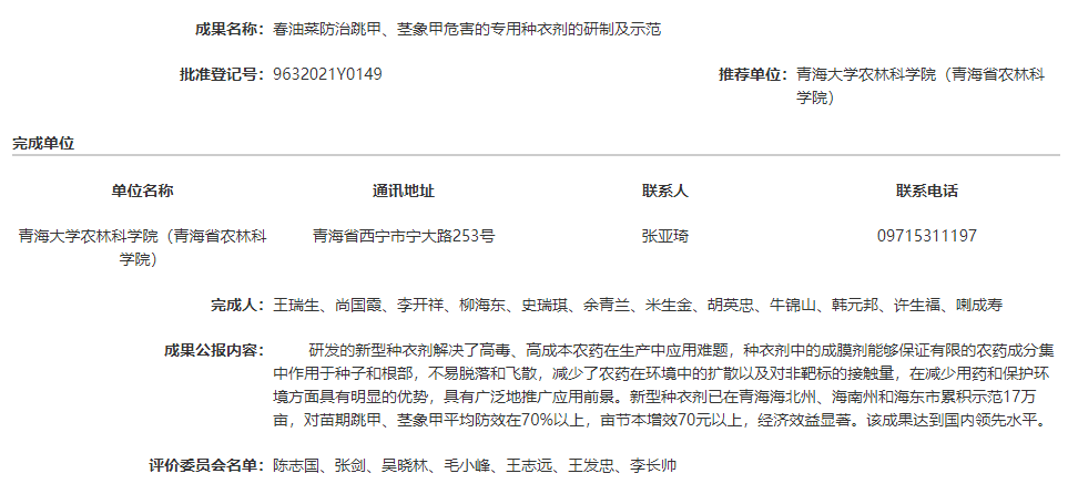 春油菜防治跳甲、茎象甲危害的专用种衣剂的研制及示范
