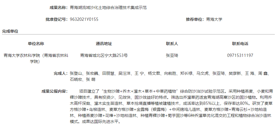 青海湖流域沙化土地综合治理技术集成示范