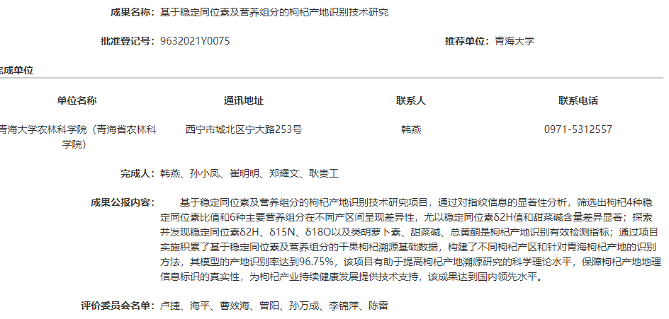 基于稳定同位素及营养组分的枸杞产地识别技术研究