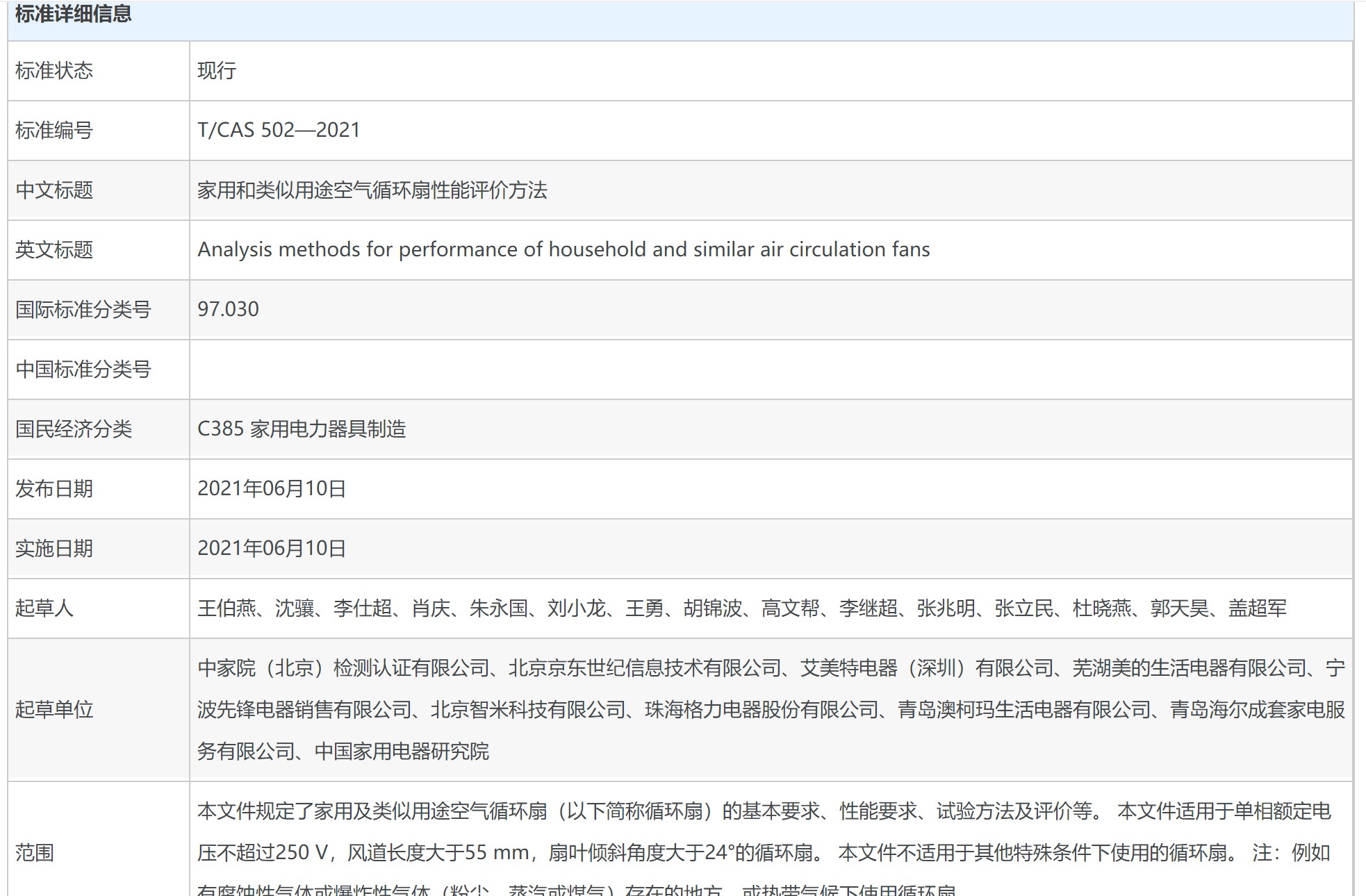 家用和类似用途空气循环扇性能评价方法