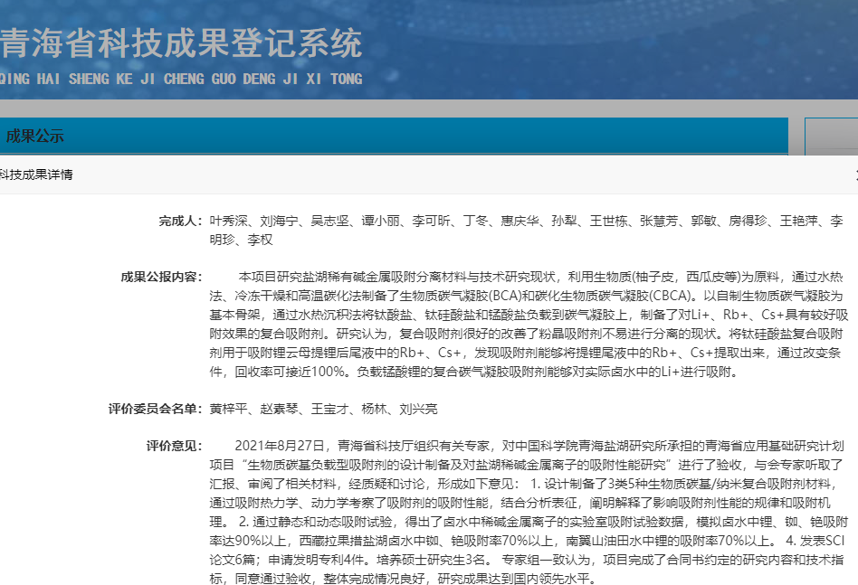 生物质碳基负载型吸附剂的设计制备及对盐湖稀碱金属离子的吸附性能研究