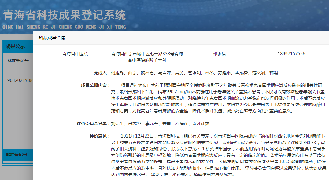 纳布啡对西宁地区全凭静脉麻醉下老年髋关节置换术患者围术期应激反应影响的相关性研究