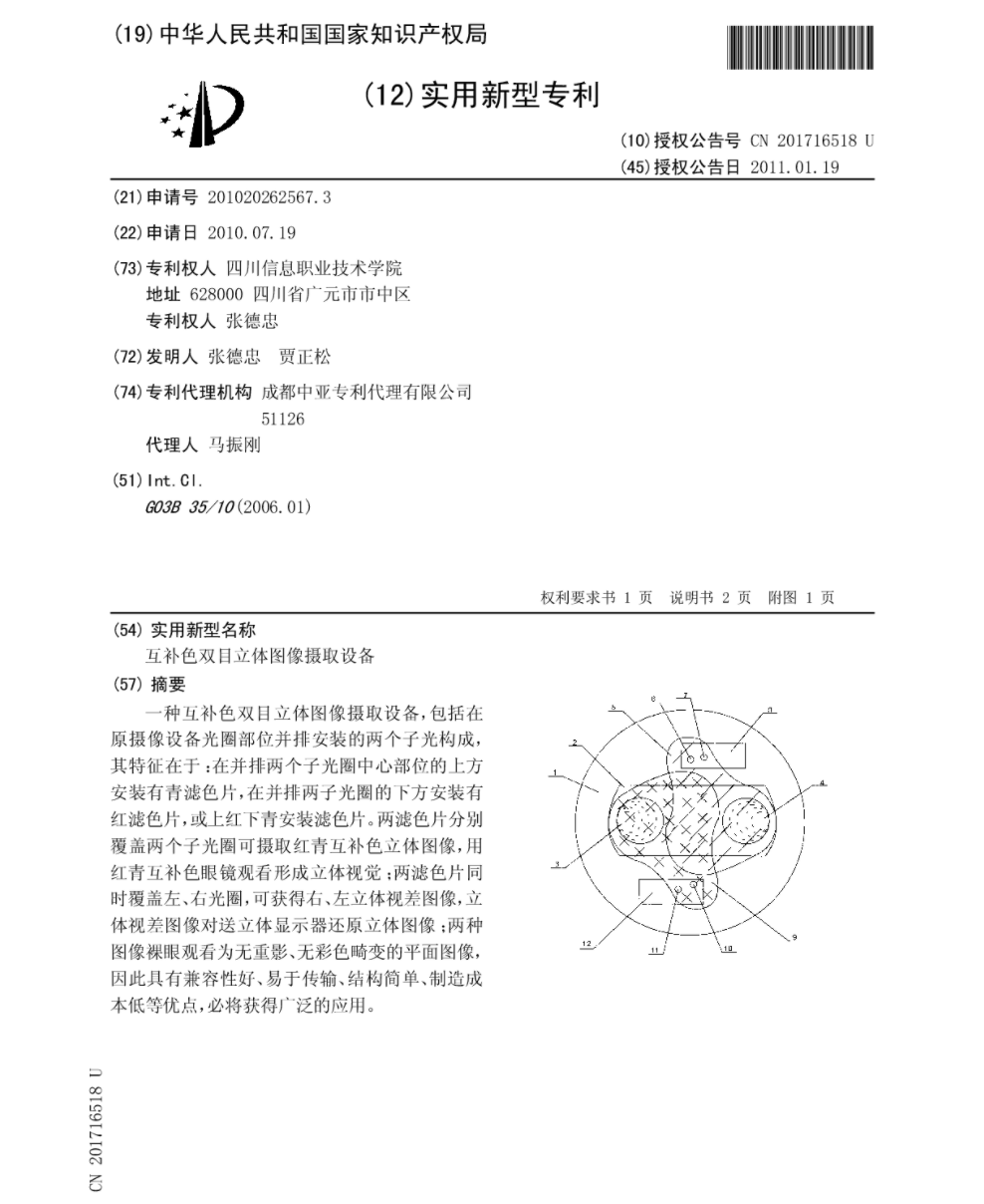 互补色双目立体图像摄取设备