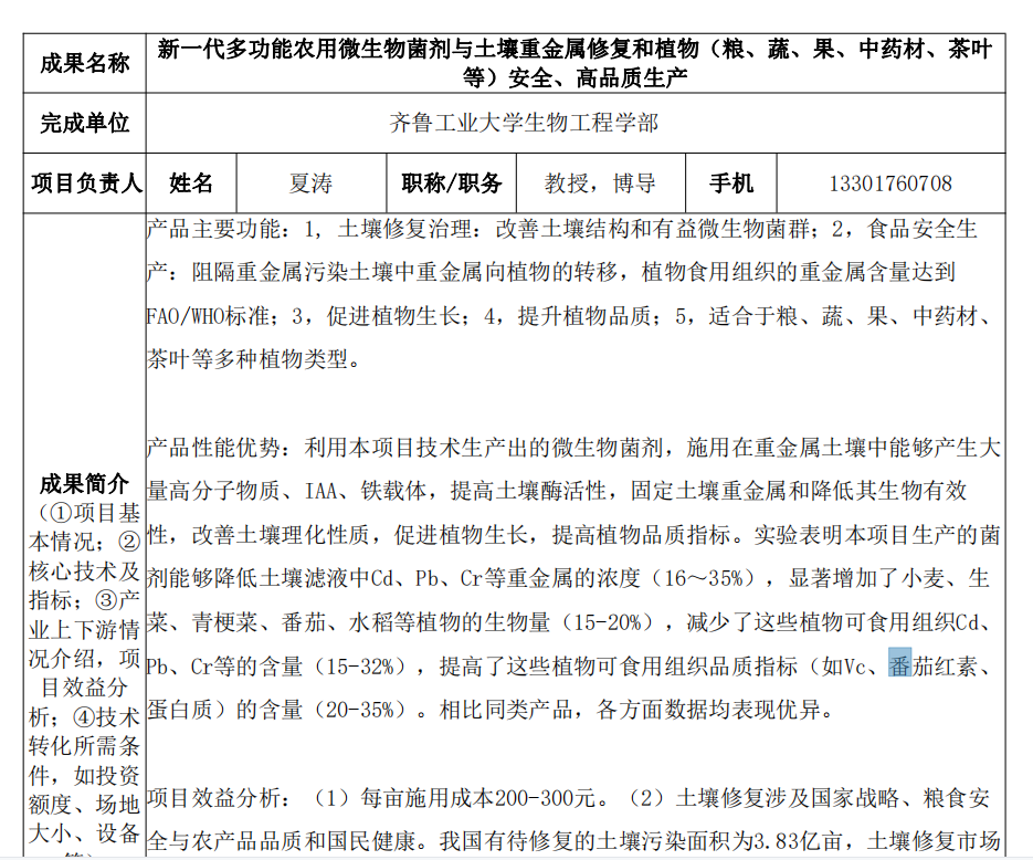 新一代多功能农用微生物菌剂与土壤重金属修复和植物(粮、蔬、果、中药材、茶叶 等)安全、高品质生产