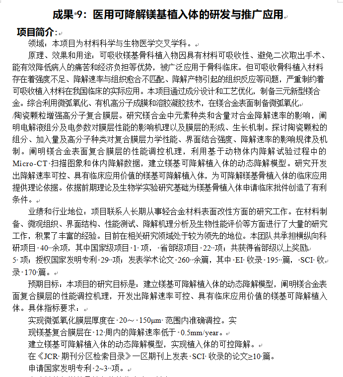 医用可降解镁基植入体的研发与推广应用