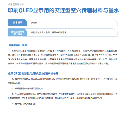 印刷QLED显示用的交连型空穴传辅材料与墨水