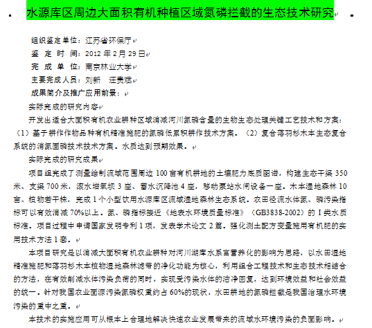 水源库区周边大面积有机种植区域氮磷拦截的生态技术研究