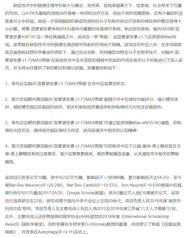 血管紧张素-(1-7)/Mas旁路保护缺血性卒中的机制研究