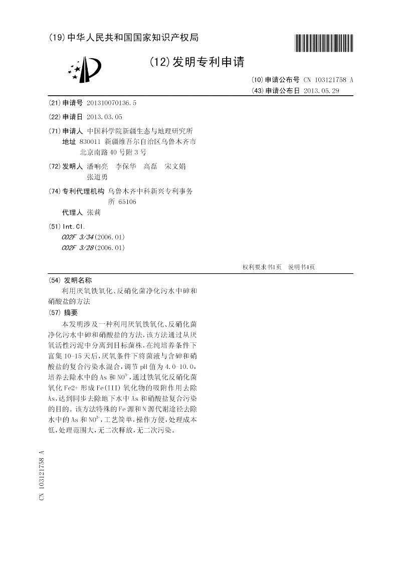 利用厌氧铁氧化、反硝化菌净化污水中砷和硝酸盐的方法
