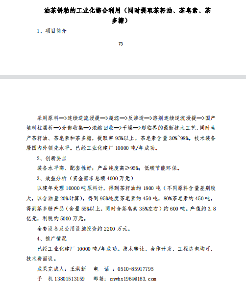 油茶饼粕的工业化综合利用(同时提取茶籽油、茶皂素、茶 多糖)