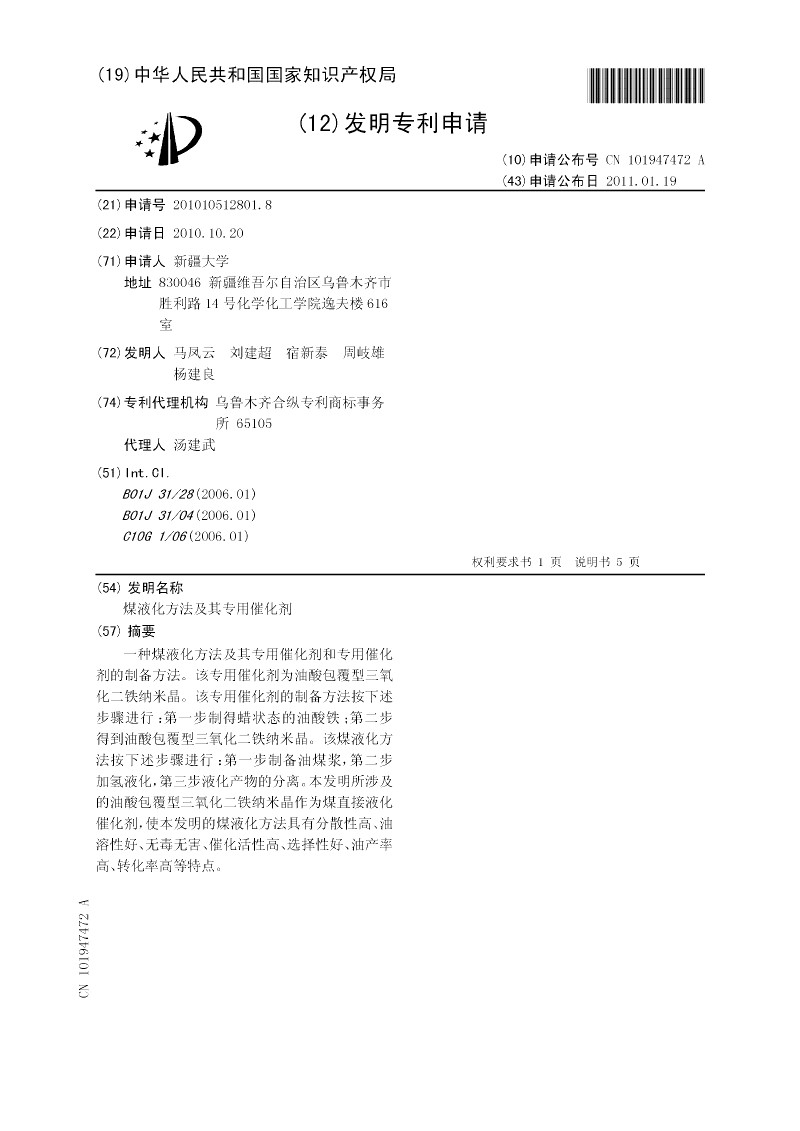 煤液化方法及其专用催化剂