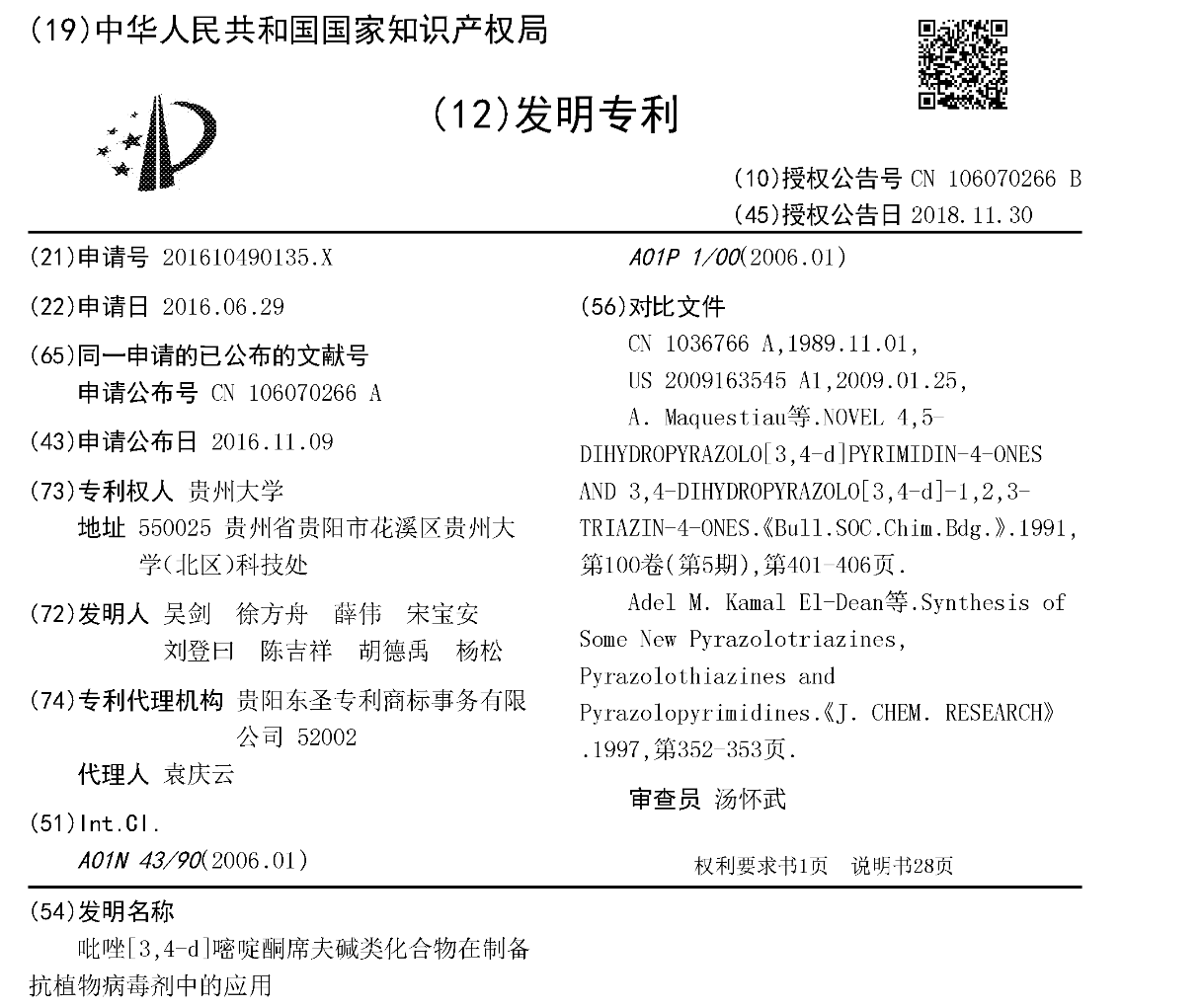 吡唑[3,4-d]嘧啶酮席夫碱类化合物在制备抗植物病毒剂中的应用