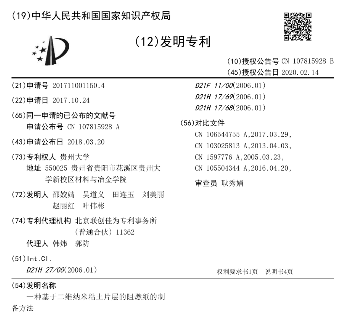 一种基于二维纳米粘土片层的阻燃纸的制备方法[