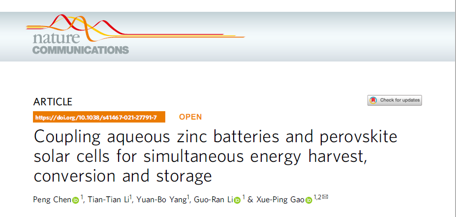 水系锌电池与钙钛矿太阳能电池集成耦合的光储能化学电源