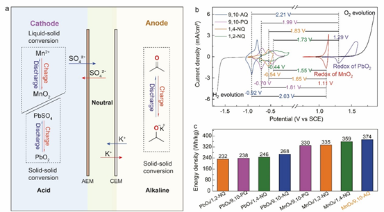 无枝晶超高倍率醌电极构筑高能碱酸混合电池