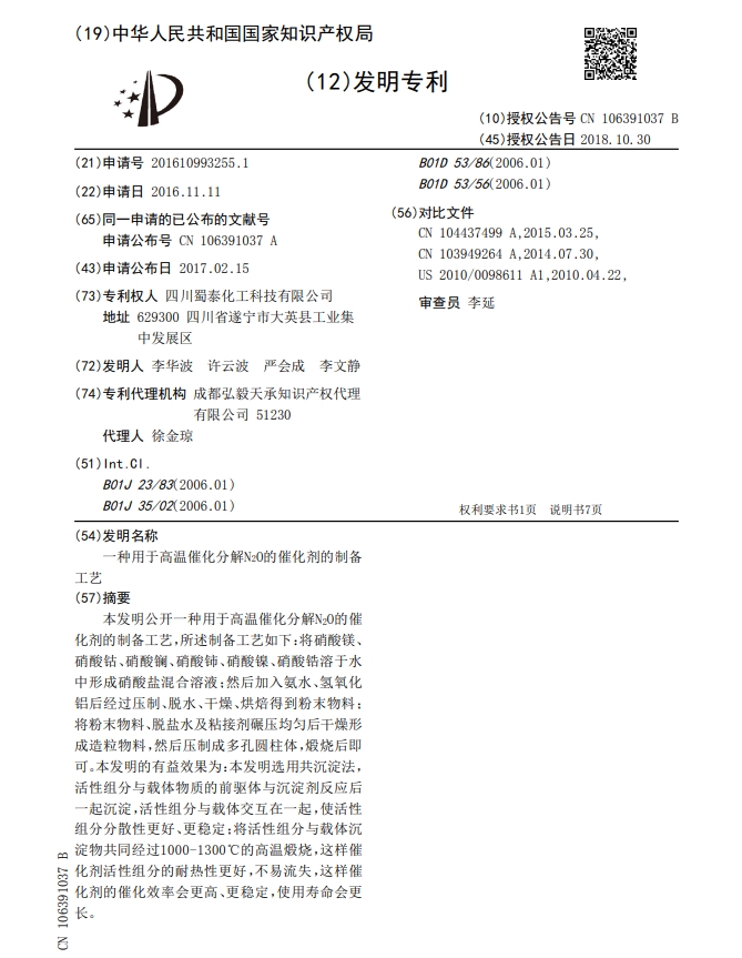 一种用于高温催化分解N2O的催化剂的制备工艺
