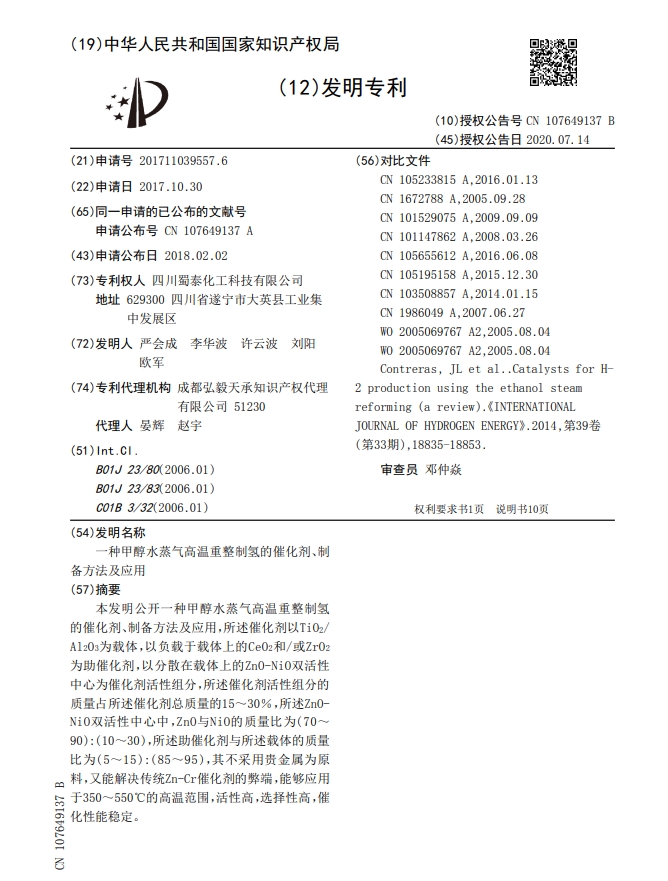 一种甲醇水蒸气高温重整制氢的催化剂、制备方法及应用