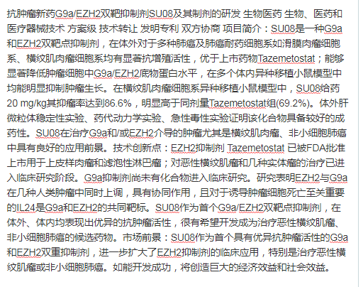抗肿瘤新药G9a/EZH2双靶抑制剂SU08及其制剂的研发