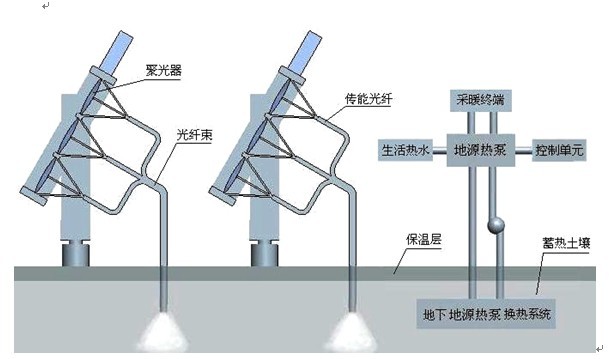 阳光纤导跨季节蓄热和地源热泵联合供热系统