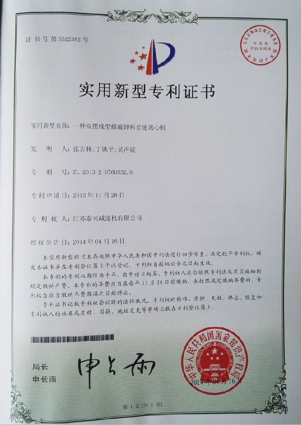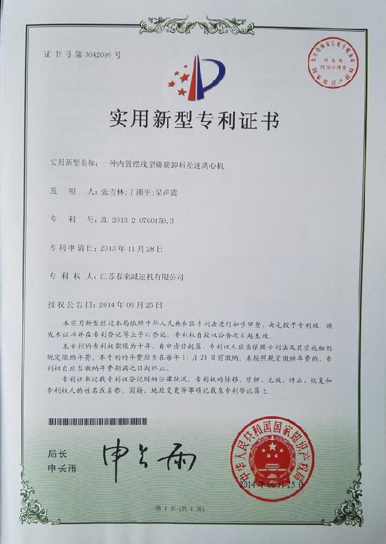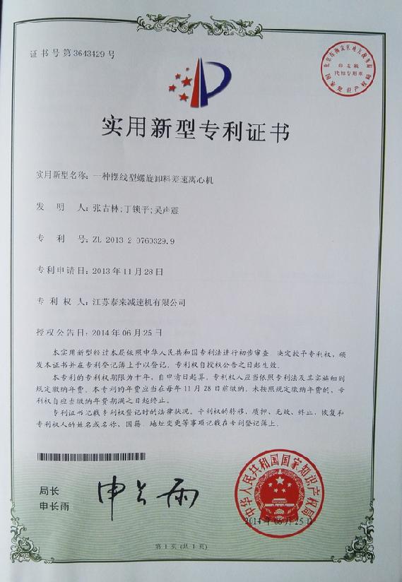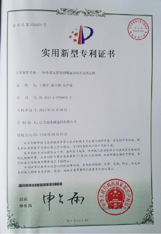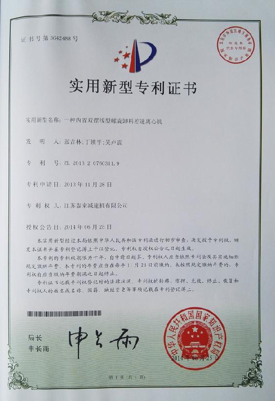 专利转让:内置双摆线型螺旋卸料差速离心机