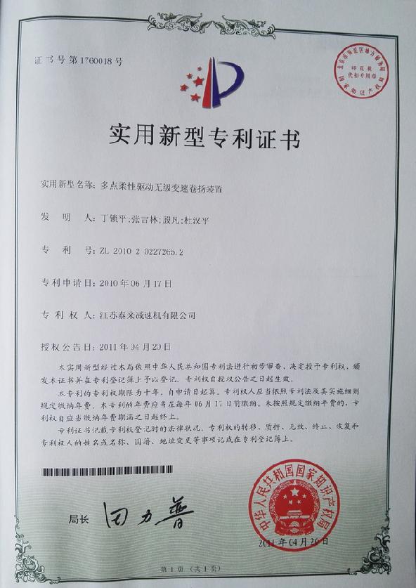 专利转让:一种多点柔性驱动无极变速卷扬装置