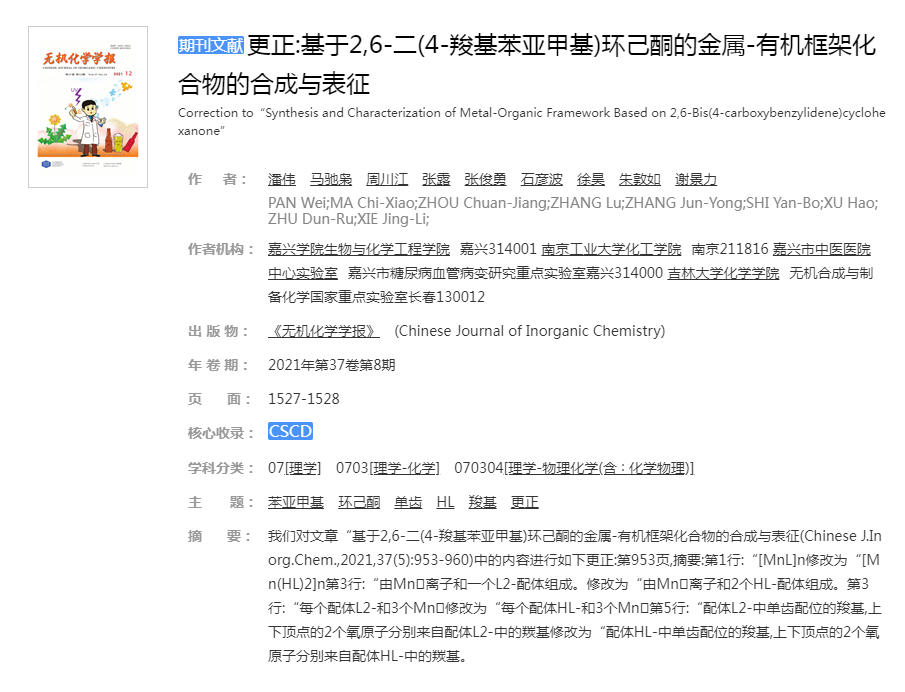 更正:基于2,6-二(4-羧基苯亚甲基)环己酮的金属-有机框架化合物的合成与表征