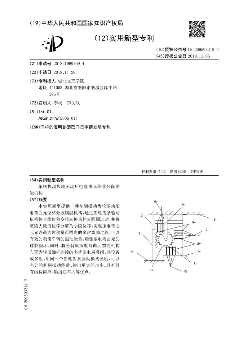 车辆振动齿轮驱动压电弯曲元位移分段馈能机构