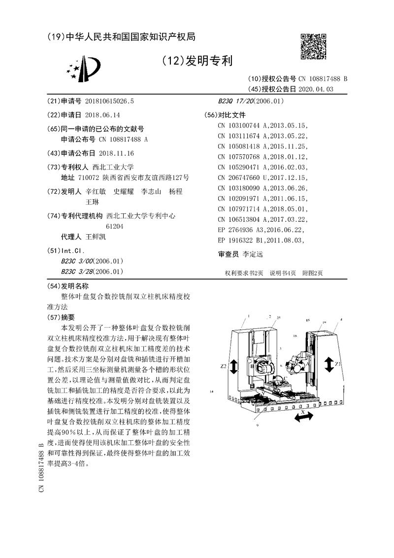 整体叶盘复合数控铣削双立柱机床精度校准方法