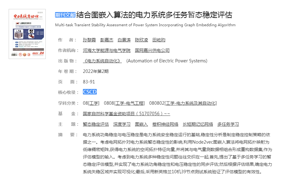 结合图嵌入算法的电力系统多任务暂态稳定评估