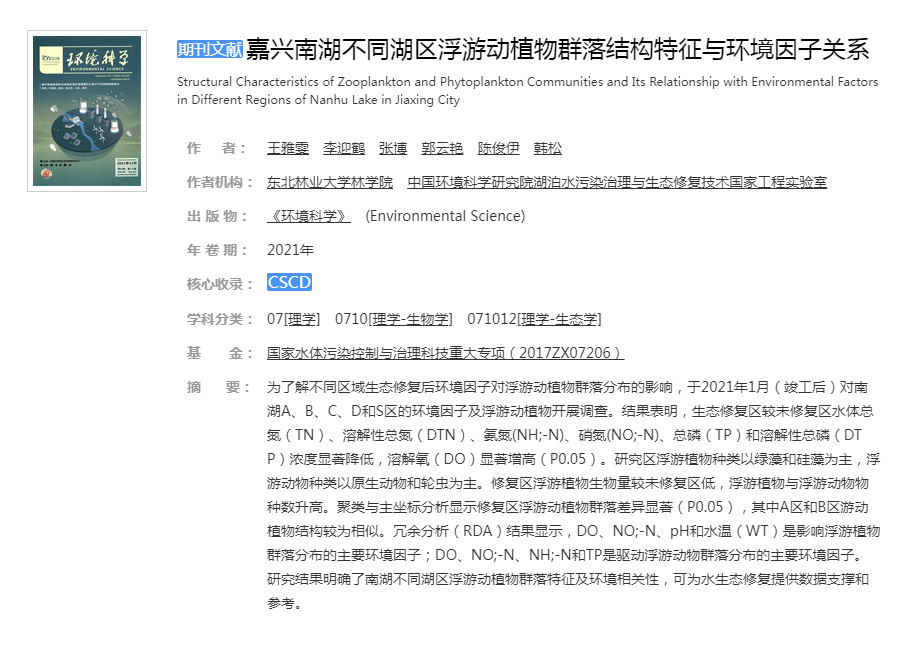 嘉兴南湖不同湖区浮游动植物群落结构特征与环境因子关系