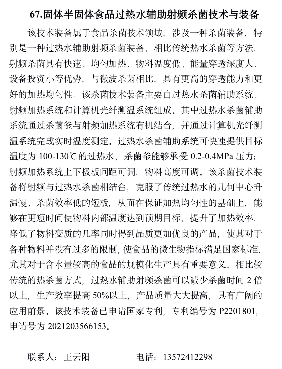固体半固体食品过热水辅助射频杀菌技术与装备
