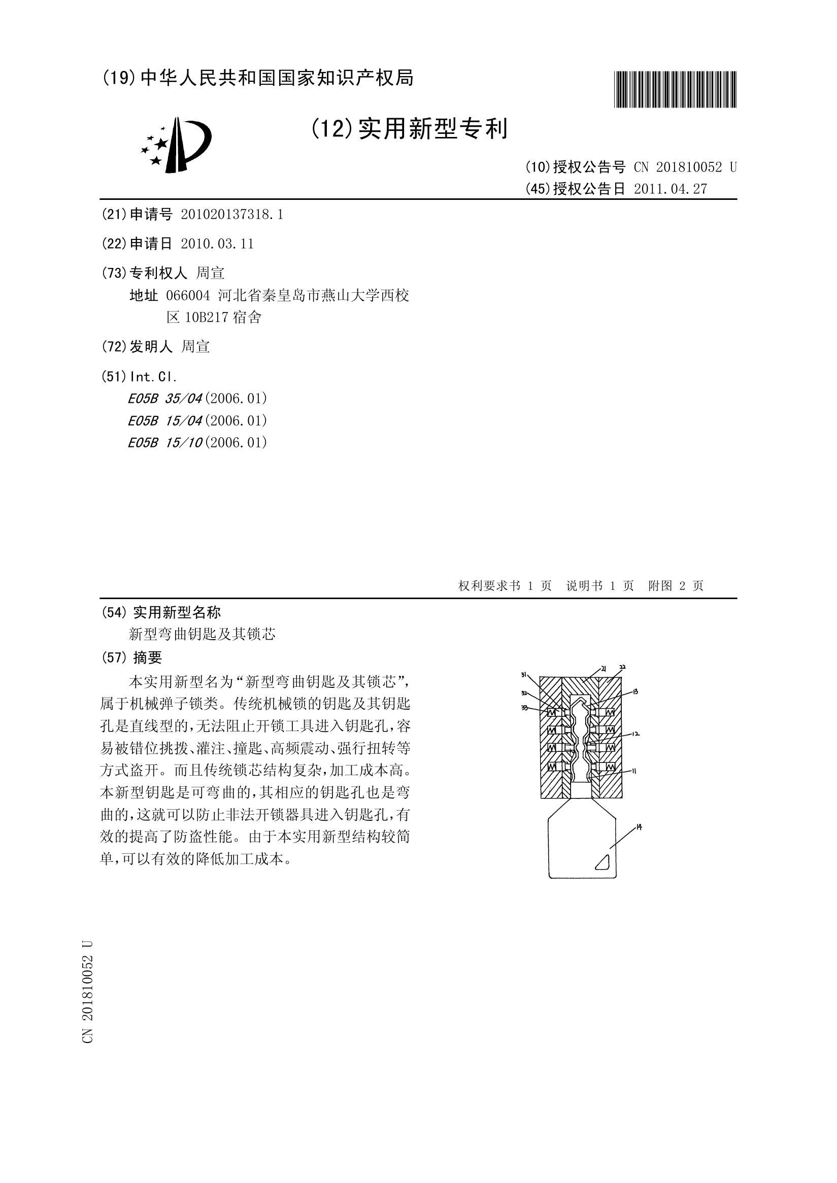 新型弯曲钥匙及其锁芯