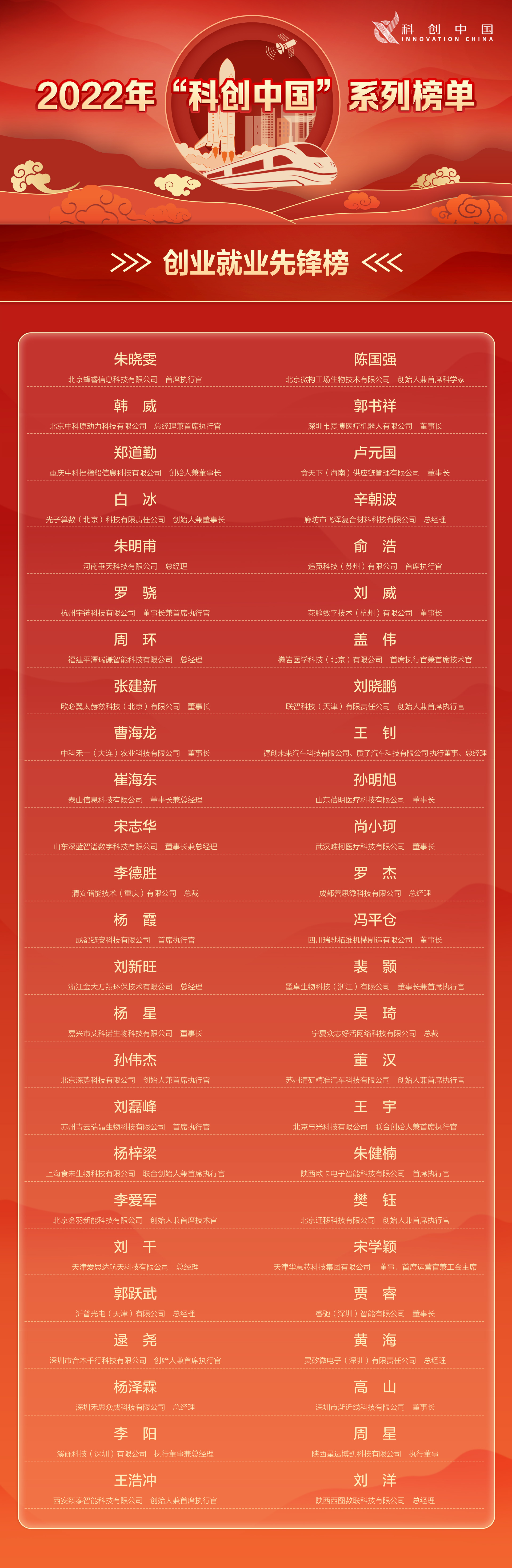 2022年“科创中国”创业就业先锋榜,举荐50位创新能力卓越、创业精神可嘉、就业带动力强的代表,以此激励更多的青年人积极进取、勇于创业,在新时代新征程中砥砺奋进、建功立业。