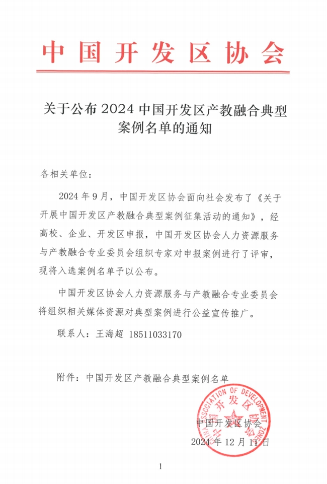 2024年9月,中国开发区协会面向社会发布了《关于开展中国开发区产教融合典型案例征集活动的通知》,经过高校、企业、开发区的积极申报,中国开发区协会人力资源服务与产教融合专业委员会组织专家对申报案例进行了评审,最终确定了此批案例入选。