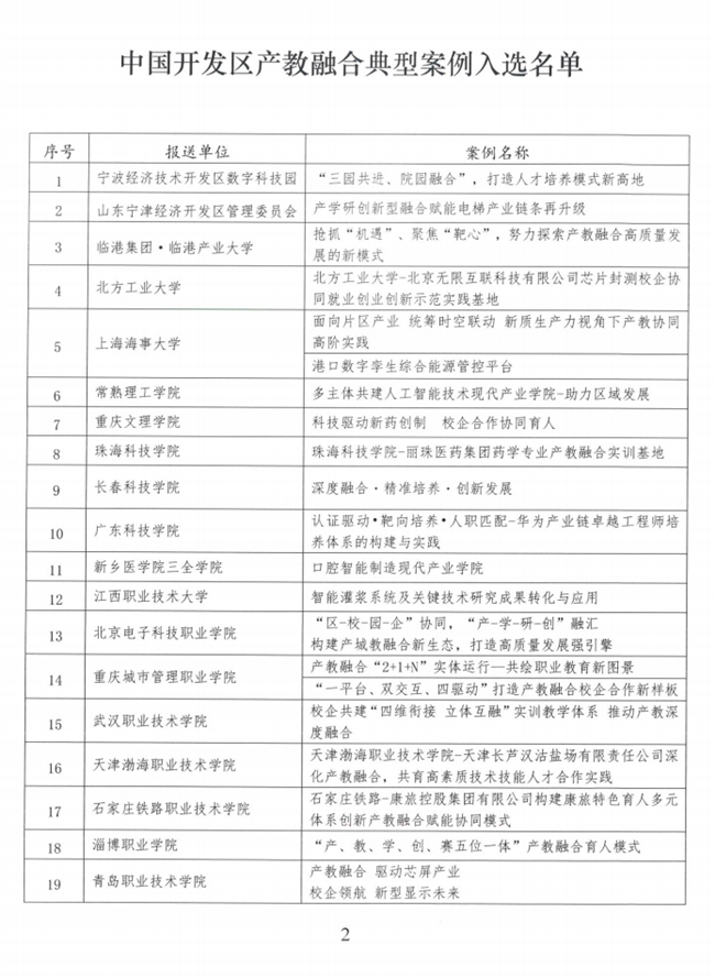 2024年12月,中国开发区协会正式公布了2024年开发区产教融合典型案例,宁波经济技术开发区数字科技园、山东宁津经济开发区管理委员会、上海临港集团·临港产业大学、北方工业大学、珠海科技学院、无锡科技职业学院等41家单位报送的50个案例入选。
