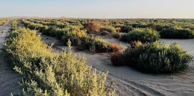 2022.6月7日,在兵团第一师十一团防沙治沙建设项目现场,长势喜人的四翅滨藜在炙热的沙漠腹地随风摇曳。