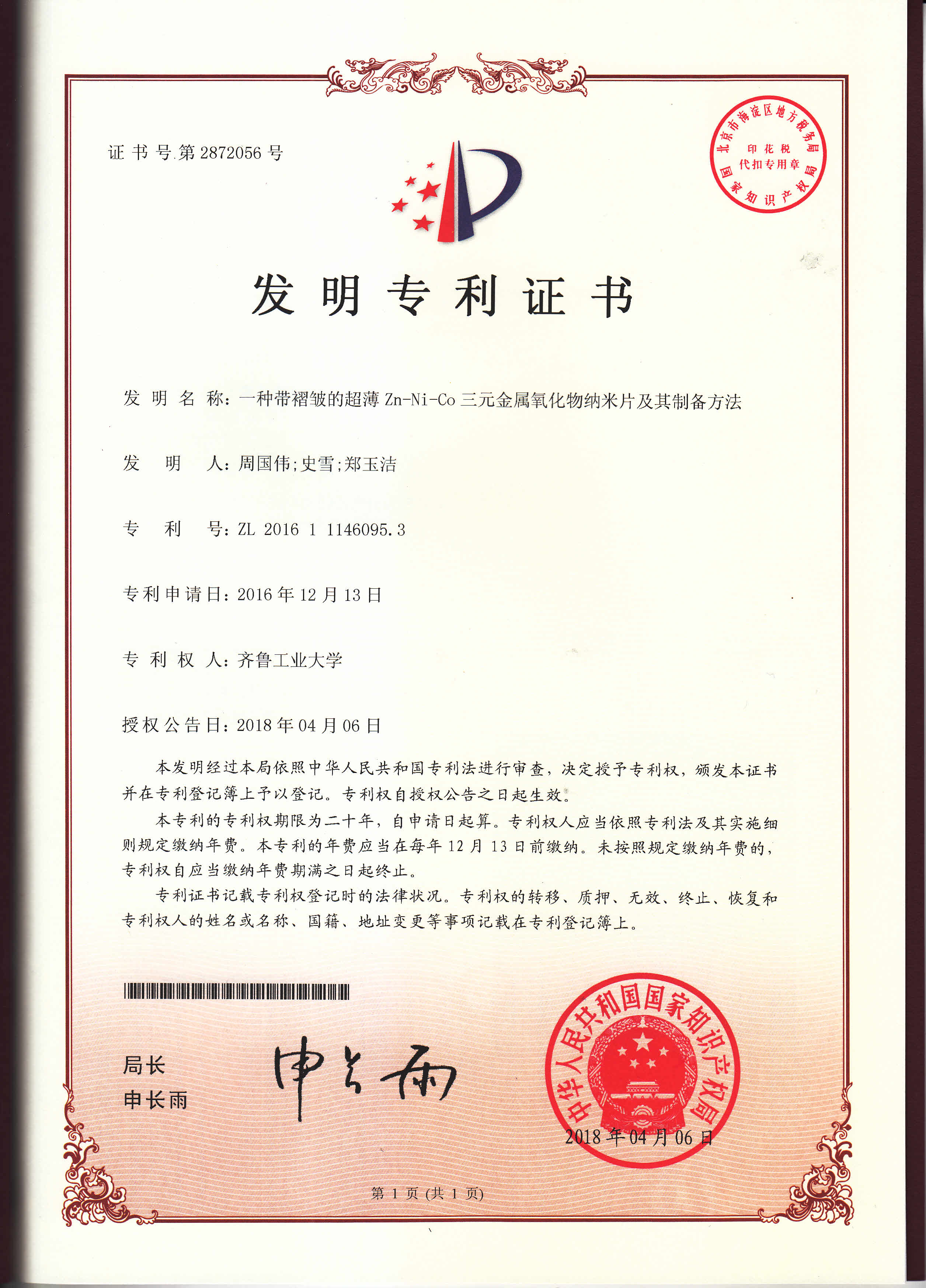 一种带褶皱的超薄Zn-Ni-Co三元金属氧化物纳米片及其制备方法