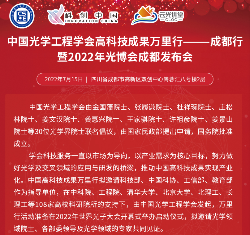 直播倒计时!!7月15日上午9:00-11:30,中国光学工程学会高科技成果万里行——成都行暨2022年光博会成都发布会线上直播开启,欢迎莅临直播间观看。