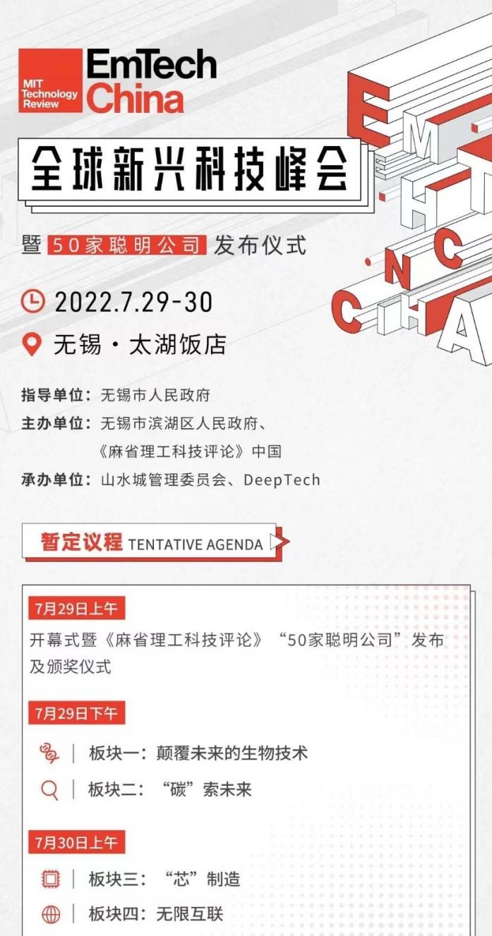 2022 年 7 月29-30日,第五届 EmTech China 全球新兴科技峰会即将在无锡开启。面对现在这个充满不确定性的全球局势,包括未来空间、颠覆未来的生物技术、“碳”索未来、“芯”制造、无限互联、量子计算、未来基石等七大主题将被展开谈论。通过数十位嘉宾的分享,为大家带来最前沿的解读。