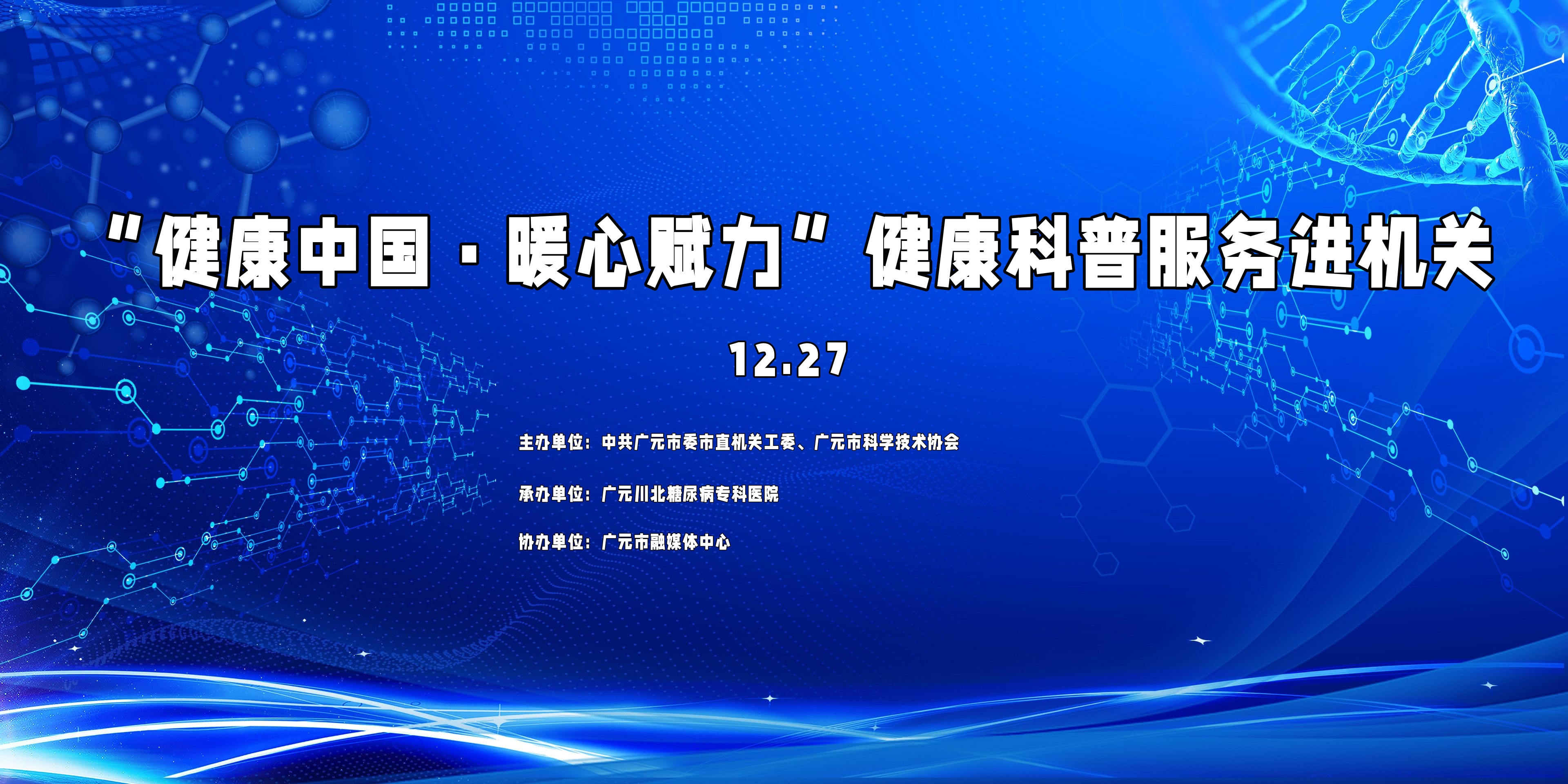 为贯彻落实党中央、国务院关于科普和科学素质建设的重要部署,扎实开展领导干部和公务员科学素质提升行动,深入落实《广元市全民科学素质行动实施方案》,聚焦机关干部职工常见病与慢病隐患,关心爱护机关干部职工的身心健康,倡导健康生活、健康工作理念,经研究,拟开展“健康中国·暖心赋力”健康科普宣传进机关活动,通过深入一线开展干部职工慢病筛查、健康义诊、健康科普讲座,进一步传播科学知识、树立健康理念、提升为民办事服务质效。