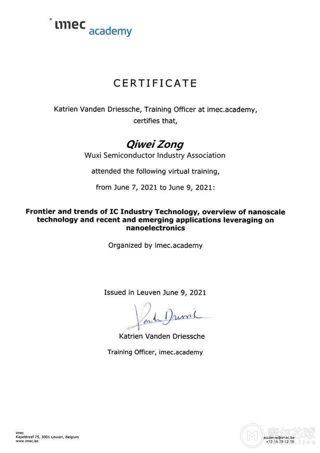 每位参加培训的学员都将获得由IMEC Academy官方颁发的亲笔签名证书一张: