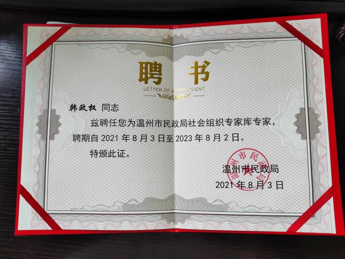 近日,温州市民政局和温州市民政局社会组织管理局在瓯e善温州市慈善基地召开社会组织专家聘任仪式,并宣读了温州市第一批社会组织专家名单,我会温州市经营师协会常务理事韩政权入选温州社会组织专家库。