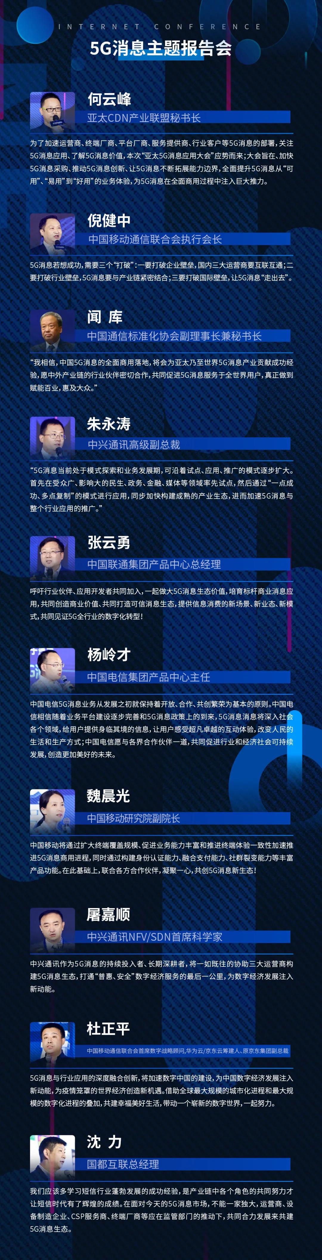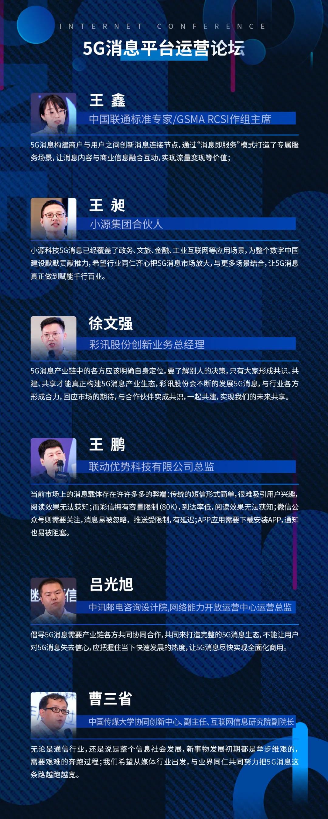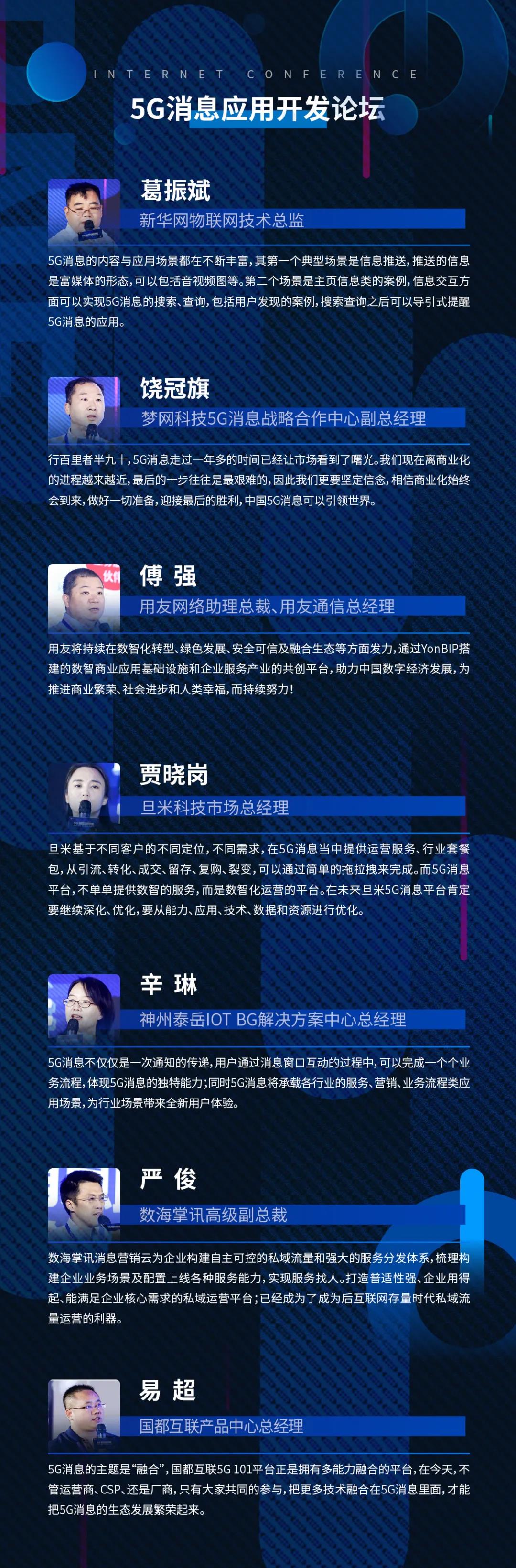 本届大会将在往届大会总结的技术经验基础上,结合5G消息在国内发展的全新趋势,呈现出5G消息在今年所体现出的突破性发展成功,带来深入各行各业的场景标杆案例。同大会将进一步聚焦5G消息在金融、政务、旅游、电商、物联网、工业制造等场景上引发的重大变更,推动5G消息成为行业的全新流量入口,助力国家5G战略应用的发展,让5G消息做真正“易用”“好用”,携手合作伙伴打造5G消息中国模式的传播者,共赢全面商用。