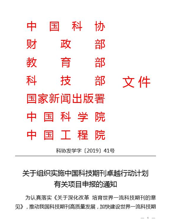 2019年9月,中国科协、财政部、教育部、科学技术部、国家新闻出版署、中国科学院、中国工程院联合启动实施“中国科技期刊卓越行动计划”,设立领军期刊、重点期刊、梯队期刊、高起点新刊、集群化试点、数字出版服务平台建设、高水平办刊人才选育等七个子项目,构建“单刊建设、刊群联动、平台托举、融合发展”支持体系。“卓越计划”以5年为周期,是迄今为止中国在科技期刊领域实施的力度最大、资金最多、范围最广的重大支持专项。截至2021年底,“卓越计划”共有340种期刊入选,其中领军期刊22种,重点期刊29种,梯队期刊199种(其中中文期刊100种),高起点新刊90种。