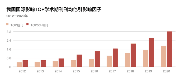 《中国学术期刊国际引证年报》数据显示:2012—2020年,我国较高影响力科技期刊种数稳步增长,影响力逐年上升。国际影响TOP(国际影响力指数CI排位前350名)科技期刊的刊均他引影响因子由0.454上升至1.955,增幅达330.6%,年均增幅为23.2%;国际影响TOP5%(国际影响力指数CI排位前175名)期刊的刊均他引影响因子由0.755上升至3.208,增幅为324.9%,年均增幅为23.0%。