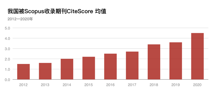 2012—2020年,我国被Scopus收录的科技期刊从532种增加至812种,增幅达52.6%,年均为增幅5.5%。影响力逐年上升,收录期刊刊均CiteScore值从1.5上升至4.5,增幅达200.0%,年均增幅为14.8%。高影响力期刊数量增长较快。2012年我国被Scopus收录的位于学科Q1区的期刊仅有20种,2020年上升至184种,增幅为820.0%,年均增幅o 33.2%。2020年,我国共有33种科技期刊影响力位于全球学科前5%。