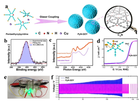 图:吡啶石墨炔的合成方法、X射线光电子能谱、X射线吸收光谱以及电催化性能和锌-空电池性能表征。