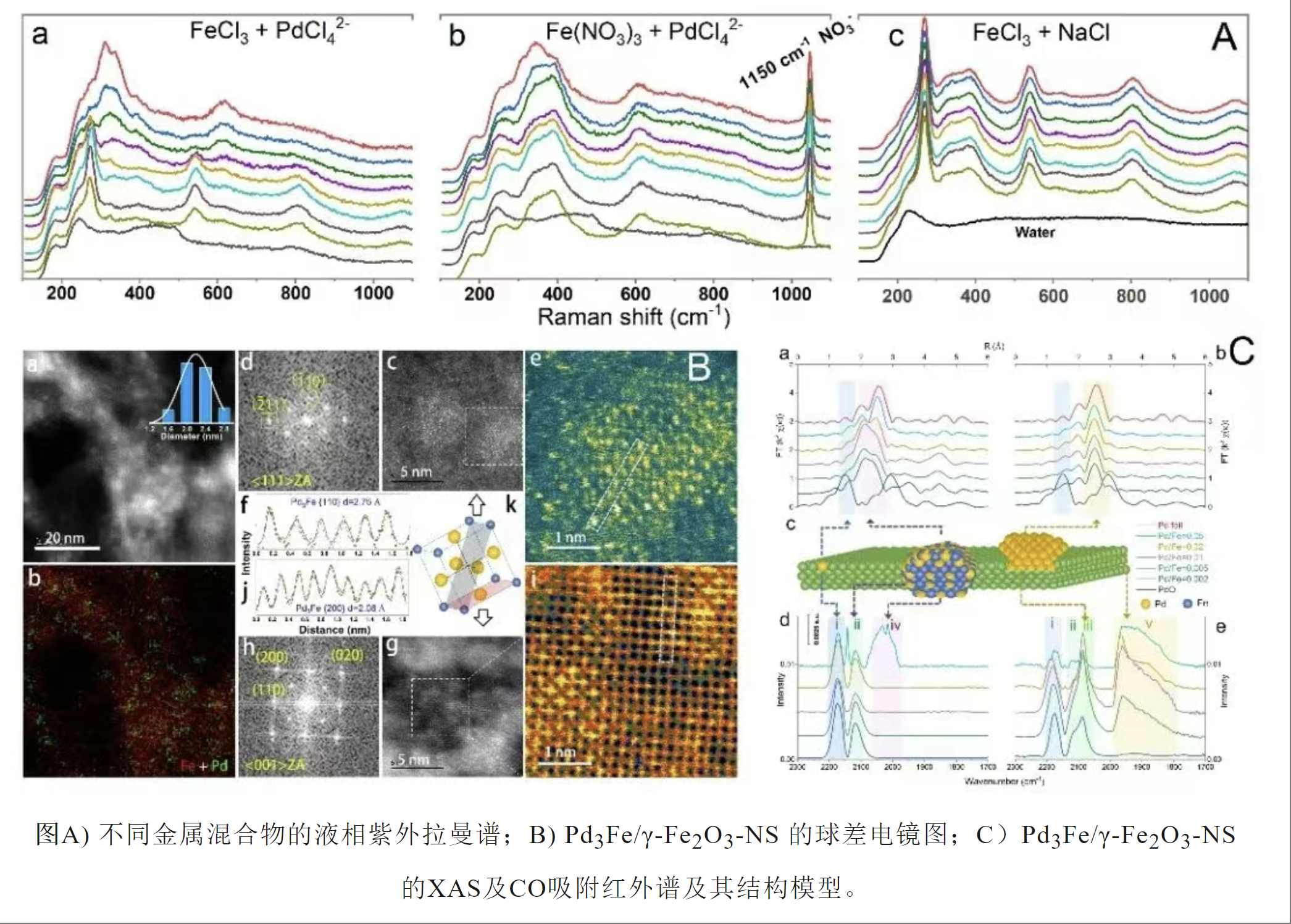 中国科学院生态环境研究中心刘景富组利用液相紫外拉曼光谱原位研究了贵金属氯化物(PdCl42-, AuCl4-以及PtCl62-)与FeCl3形成的混合物在水相中的配位结构,发现来自贵金属氯化物的Cl-配体可以被Fe3+共享。通过这一配体共享过程,Fe的配位结构由FeCl2(H2O)4-/FeCl3(H2O)3转化为四配位的FeCl4-(图A)。这一转化过程非常罕见,因为在正常条件下FeCl4-只能在高温或者高浓度Cl-条件下发生。更重要的是通过共享Cl-配体,Fe与贵金属离子形成了双金属配合物,FexMyClzn-经过简单的化学还原即可转化为双金属团簇,并自发转化为高度有序的金属化合物(如Pd3Fe),从而实现了室温下金属化合物团簇的快速合成。此外,在化学还原条件下,过量的Fe前驱体会同步转化为γ-Fe2O3超薄纳米片,并自发作为载体负载金属化合物团簇(图B)。借助上海光源X-射线吸收线站的设施,利用XAS对合成材料的配位结构进行了解析,证明贵金属与Fe形成了有序的M3Fe结构,其粒径约为2 nm。原位吸附CO吸附红外证实了该材料以镶嵌而非表面吸附的形式负载在纳米片,这种负载方式赋予了设计的催化剂极高的稳定性(图C)。催化实验表明,该材料具有极高的催化活性,每个Pd原子可以活化106个C-I键以上。同时,该材料还具有优良的稳定性,在140oC下反应12小时仍无明显Pd团聚。值得一提的是本方法可以用于Au, Pt,Rh,Ru和Ir等高催化活性的贵金属的金属化合物合成,因而有望用于有实用价值贵金属催化剂的设计与制备。