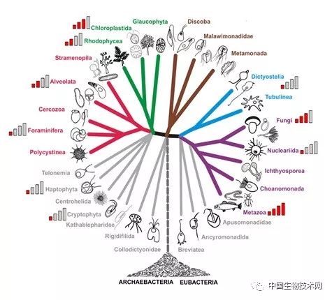 图1. 形态种在真核生物中的广泛分布(柱状图表示各真核生物类群中形态种报道数目的多少,