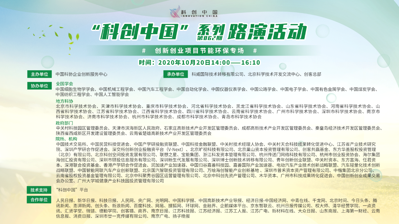 “科创中国”系列路演活动第062期——创新创业项目节能环保专场,将于2020年10月20日14:00至16:10开启线上直播。